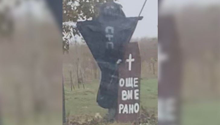 Стряскащо, но и отрезвяващо плашило се появи край оживен роден път. Черна фигура с коса, която спокойно може да оприличим на Смъртта от митологията, носи ясно послание - шофирайте внимателно. Още повече, че на на "гърдите" ѝ стои красноречиво съкращение - ПТП, така че да не се объркаме.