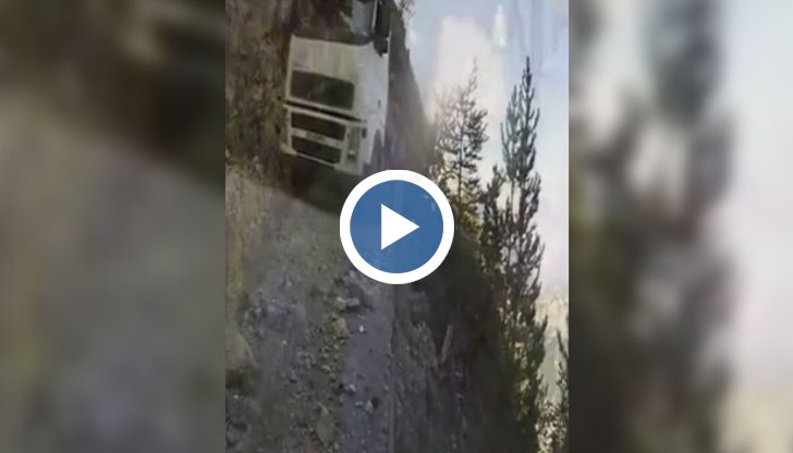 Превозното средство е натоварено с дървени трупи и с феноменална точност преминава през тясна змиевидна пътека, граничеща със страховита пропаст.