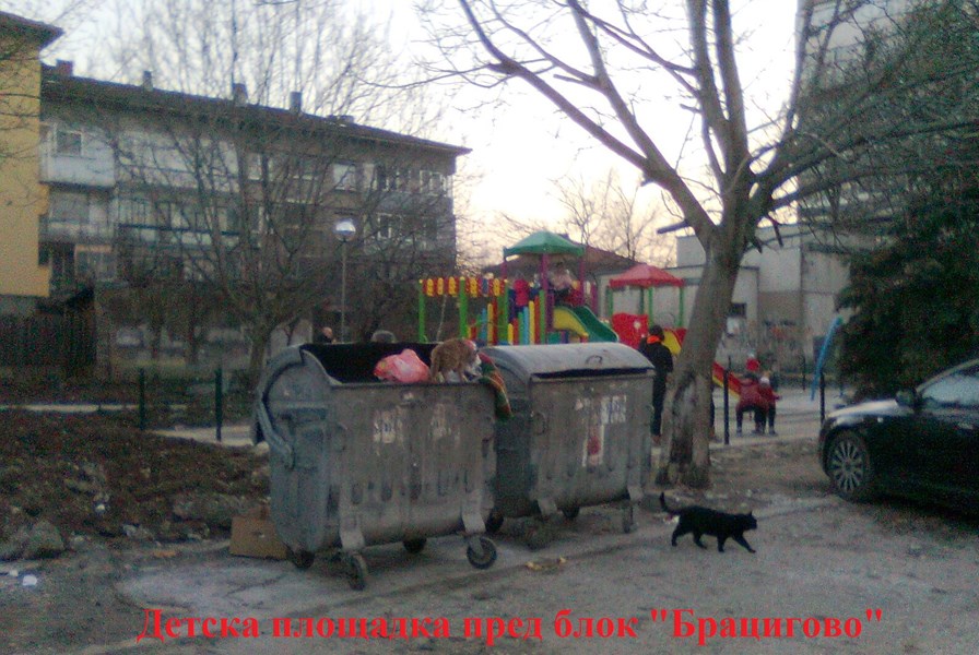 Миналата година изпращах два пъти сигнал и снимка на детска площадка с контейнери за битови отпадъци с предложение да бъдат преместени тези контейнери. За съжаление децата продължават да играят около контейнерите за битови отпадъци заедно с безстопанствени котки и кучета.