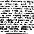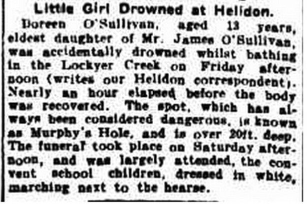 „Дорийн О'Съливън на 13 години, най-голямата дъщеря на г-н Джеймс О'Съливън се удави трагично, докато се къпела в река Локиър миналия петък следобед. Изминава близо час, преди тялото да бъде открито. Мястото винаги е било смятано за изключително опасно за къпане и се нарича „Дупката на Мърфи“. Дълбочината му е над 6 метра. Погребението се състоя в неделя и на него присъства огромно множество. Сьученичките на Дорийн от католическото училище изпроводиха ковчега, облечени целите в бяло.“