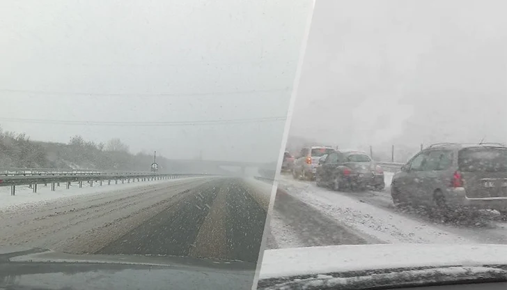 Внезапен студен фронт и обилен снеговалеж предизвикаха транспортен хаос на автомагистрала "Хемус" в района на Варна днес следобед. Десетки тежкотоварни камиони и автобуси са блокирани в участъка между Езерово и отбивката за Повеляново, създавайки километрични задръствания в посока морската столица.
