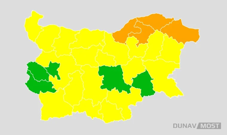Националният институт по метеорология и хидрология (НИМХ) е обявил оранжев код за втора степен на опасност в 11 области, включително Русе, Велико Търново, Монтана и София-област, където се очакват обилни валежи от дъжд и сняг. За други шест области, сред които Пловдив, Стара Загора и Варна, е в сила жълт код поради риск от поледици и силен вятър. Синоптиците предупреждават, че комбинацията от ниски температури и влага ще направи пътните настилки изключително хлъзгави.