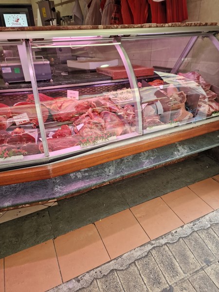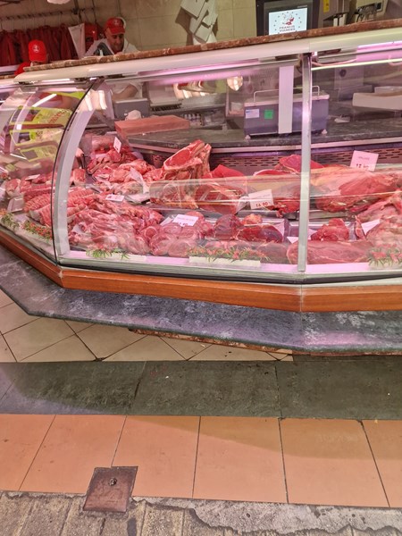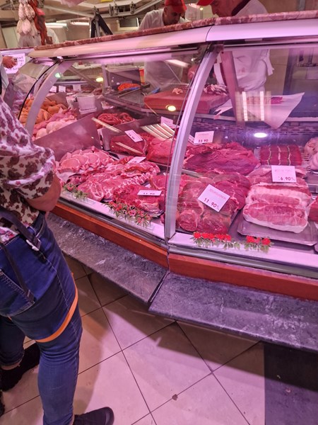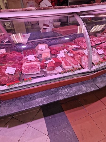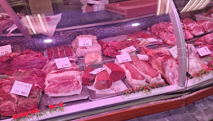 На публикуваните снимки се виждат различни видове месо във витрини на месарски магазин с ясно обозначени цени в евро. Някои от видимите цени варират между 6,90 и 23,90 евро за килограм, което според част от коментиращите изглежда по-ниско от текущите цени на месото в България.