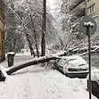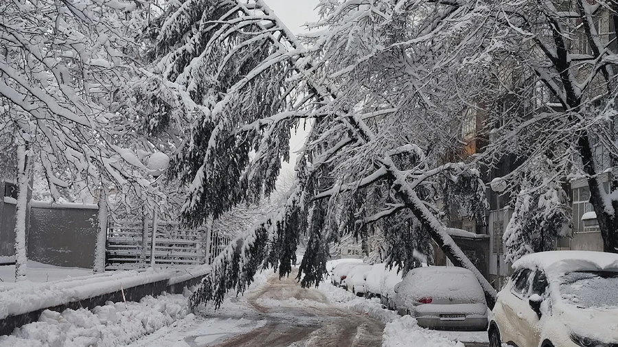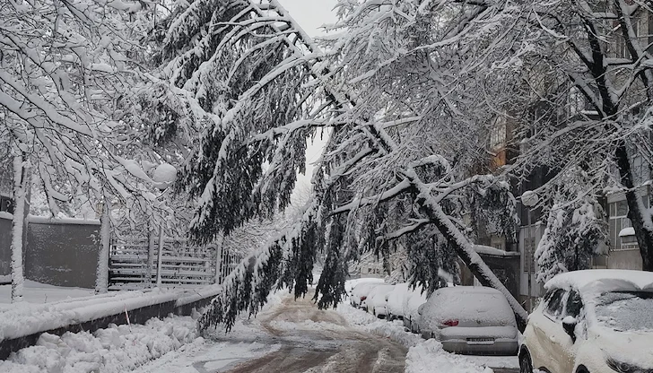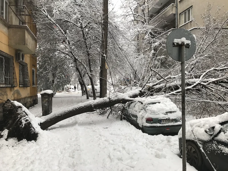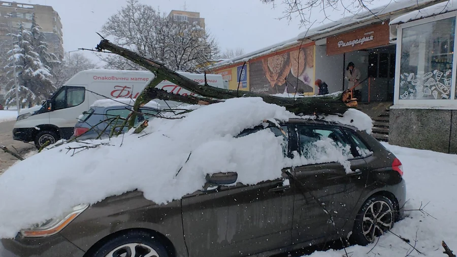 Сняг събори масивни дървета върху паркирани автомобили в Русе