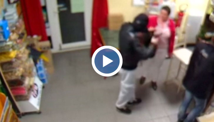 Тогава собственичката спокойно дава бебето на майка си, а след това се обръща към мъжа, който ѝ подава чанта, очевидно за да сложи парите в нея. Жената започва да спори с обирджията, а след това му налита да го бие, като го удря многократно със сака, който самият той й е дал. В битката се включват и клиенти, които прогонват крадеца със столове.
