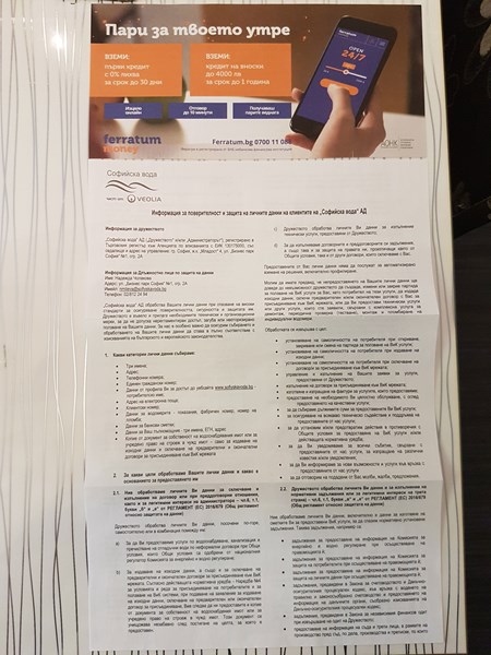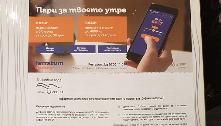 В Асоциацията за защита на потребителите (АЗП) се получиха сигнали от клиенти на „Софийска вода“, че заедно с уведомленията за месечните сметки, получават и брошури с реклама на фирмата за бързи кредити „Фератум“.