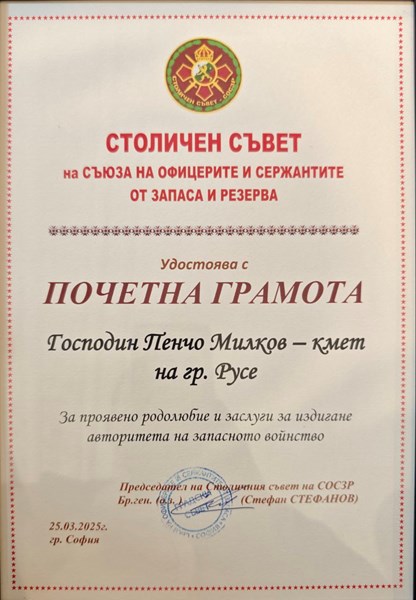 Кметът на община Русе Пенчо Милков получи почетна грамота от Столичната организация на Съюза на офицерите и сержантите от запаса и резерва (СОСЗР). Това стана ясно от съобщение на община Русе.