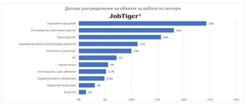 Най-голям дял от обявите през март е в сектор "Търговия и продажби" (24%), следван от "Хотелиерство и ресторантьорство" (16%), "Производство" (16%), "Административни и обслужващи дейности" (11%) и "Логистика и транспорт" (10%).