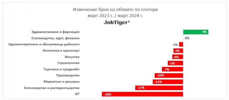 Пазарът на труда през март 2024 г. бележи спад на годишна база, сочат данните от ежемесечния анализ на JobTiger. Обявите за работа са с 11% по-малко спрямо същия месец на миналата година.