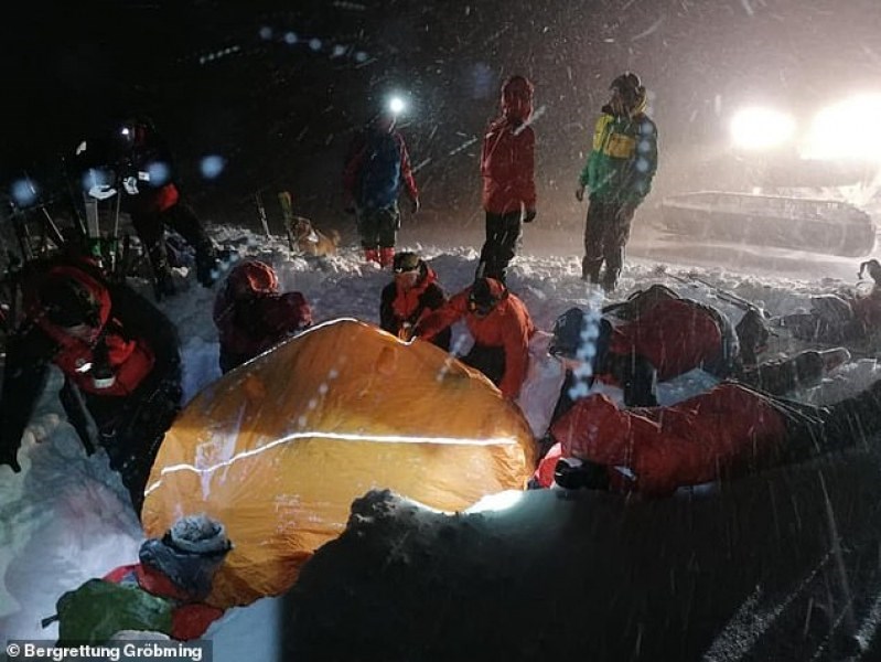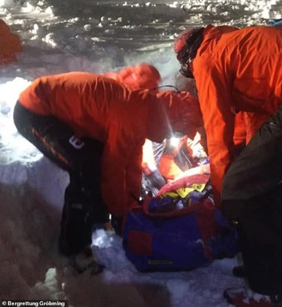 Спасители, кучета и полицаи от близкото село Грьобминг претърсвали района над 2 часа, преди да установят местонахождението на скиора. За щастие мъжът бил оборудван със специален предавател в случай на лавини, който изпраща сигнали, и спасителите успели да го измъкнат. Скиорът бил покрит от близо 5 метра сняг, но оцелял, благодарение на това, че над лицето му се образувал въздушен джоб под снежното одеяло, и можел да диша. Бил закаран в болница в Шладминг, където се установило, че освен хипотермията, нямал сериозни наранявания.