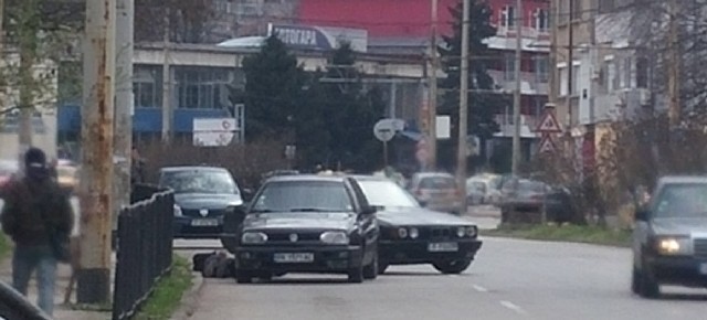 Те са закопчани с белезници и са повалени на земята до три спрени коли.
