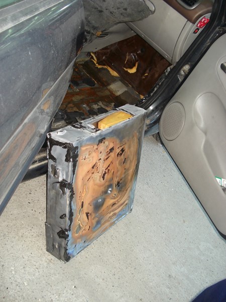 Митническите служители селектирали автомобила с българска регистрация за извършване на допълнителна проверка. Под пода на двете предни седалки са били открити правоъгълни метални контейнери, покрити с оловна ламарина. След демонтаж на седалките и изолационното покритие на пода, от тайниците са били извадени 33 пакета, съдържащи пресовано прахообразно вещество. При полеви наркотест веществото реагирало на хероин. Общото количество на намерения наркотик е 16,916 кг.