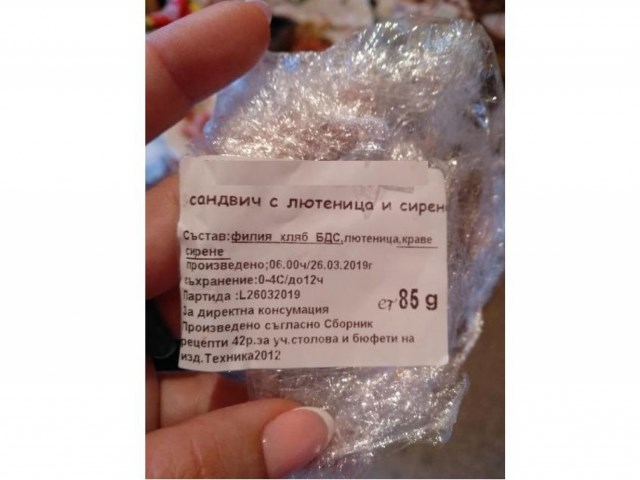 Визуално продуктът изглежда кошмарно – две филийки (в етикета е сочи, че са от хляб по БДС), боядисани с нещо оранжево и микроскопични следи от сирене. Всичко това е 85 гр., а частната фирма-производител твърди в етикета, че закуската е направена съгласно „Сборник рецепти за ученическите столове и бюфети“, информира местният сайт „Черно море“ .