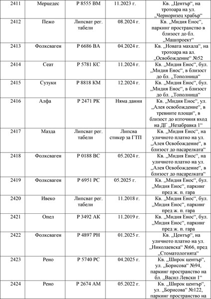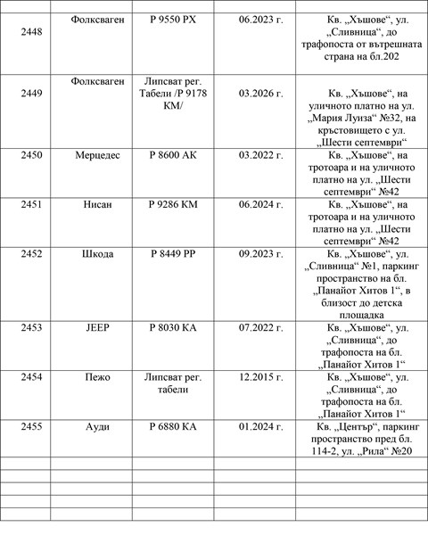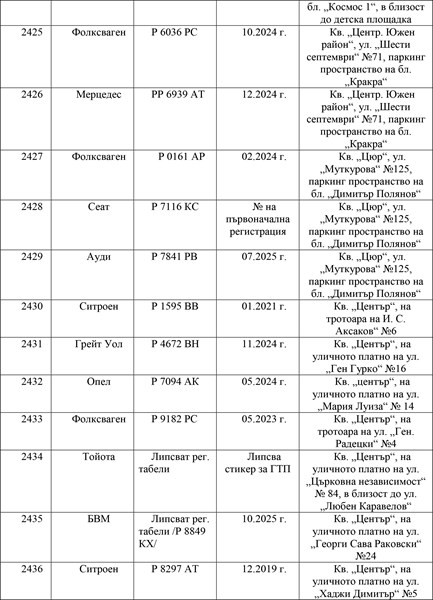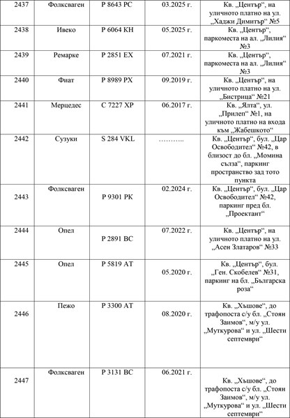 Вижте пълния списък с регистрационните номера и местоположението на маркираните 55 автомобила: