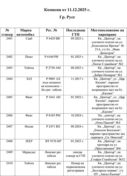 Общо 55 моторни превозни средства в Русе бяха маркирани с предписания за премахване след инспекция на общинска комисия, проведена вчера, 11 декември 2025 година. Мярката е насочена към автомобили, за които има съмнение, че са излезли от употреба и изоставени от собствениците им, съобщиха от Община Русе.
