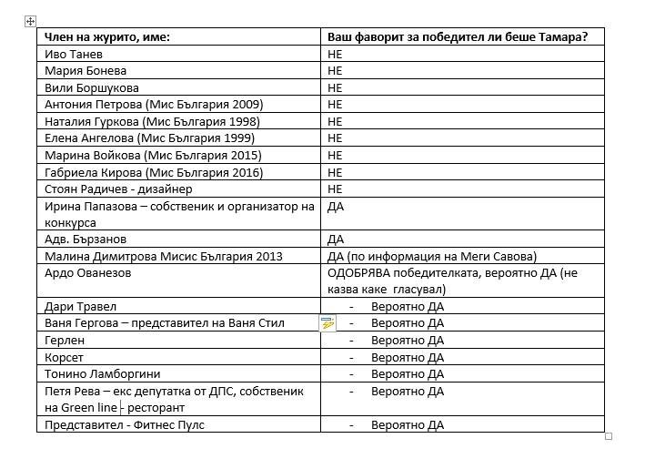 Собственичката и организаторката на конкурса Ирина Папазова е дала своето ДА за Тамара. Което прави 4 ДА-та. Остават още 7 членове на журито. Папазова казва, че Тамара е получила 6 спонсорски награди и че споснорите са фаворизирали Тамара за победител.
