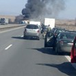 На кадри, изпратени от зрител, се вижда, че возилото се е преобърнало и се е запалило.