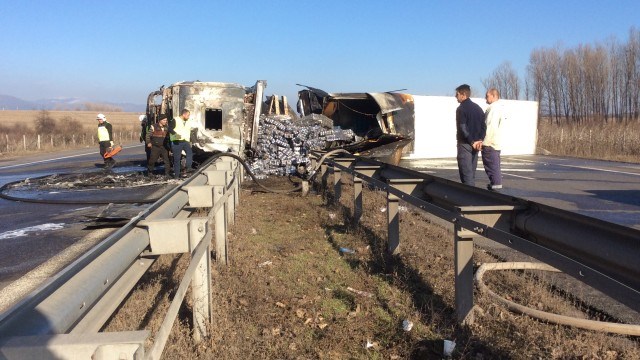 При инцидента няма пострадали. Пред bTV единият от шофьорите разказва, че около 13 ч. усетил поднасяне, след което возилото, натоварено с газирана вода, се преобърнало.