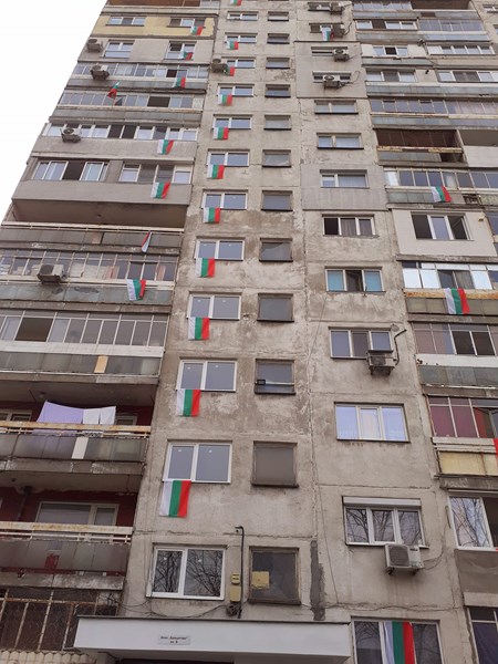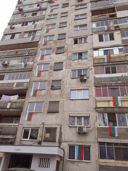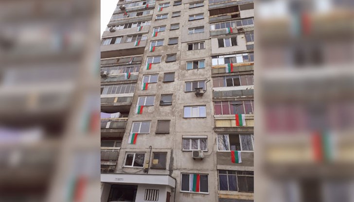 Живущи в блок "Брацигово" в русенския квартал "Родина" почетоха 3-ти март като спуснаха през балконите и прозорците си десетки национални флагове. За това научаваме от публикация на русенка в социалната мрежа, която публикува снимки на блока и сподели, че се чувства горда.