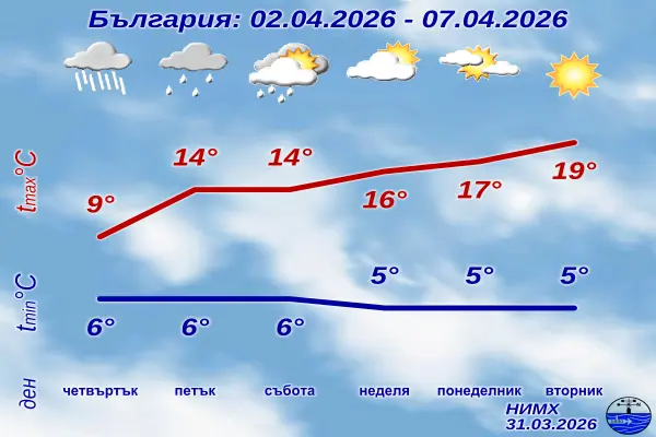 През петък и събота преваляванията ще продължат, но ще бъдат с прекъсвания и с по-слаб интензитет. Заедно с това ще започне и постепенно повишение на температурите, които ще достигнат между 12 и 17 градуса.
