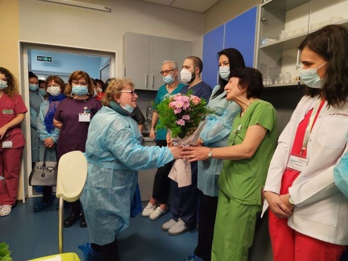 Старшата акушерка Евгения Йорданова изми ръцете на д-р Стела Минчева в УМБАЛ "Медика"