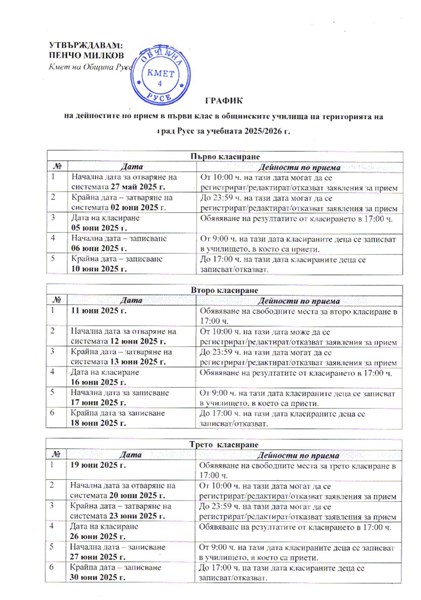Съгласно утвърдения график, публикуван в електронната система за прием, първото класиране ще бъде обявено на 5 юни в 17:00 часа. Записването на приетите деца ще се осъществява от 6 до 10 юни в съответното училище. След това предстоят още две класирания – на 16 и 26 юни.