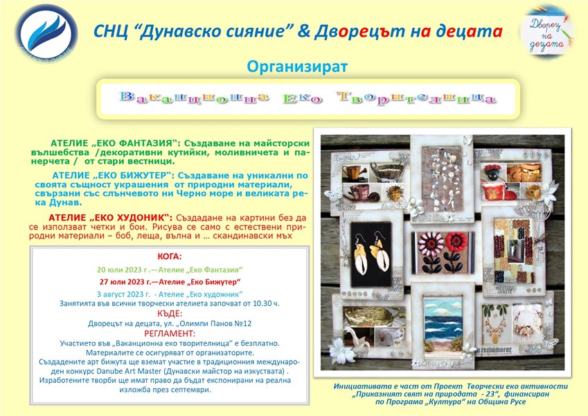 От 20 юли / Четвъртък / СНЦ „Дунавско сияние“ стартира традиционната Ваканционна еко творителница за любителите на приложното творчество. Арт ателиета ще се провеждат в Дворецът на децата, партньор на арт инициативата. В тях ще участват предимно деца от Двореца, които свободно ще могат да развият своята фантазия, свързана с природата и с нетрадиционни идеи за опазване на околната среда.
