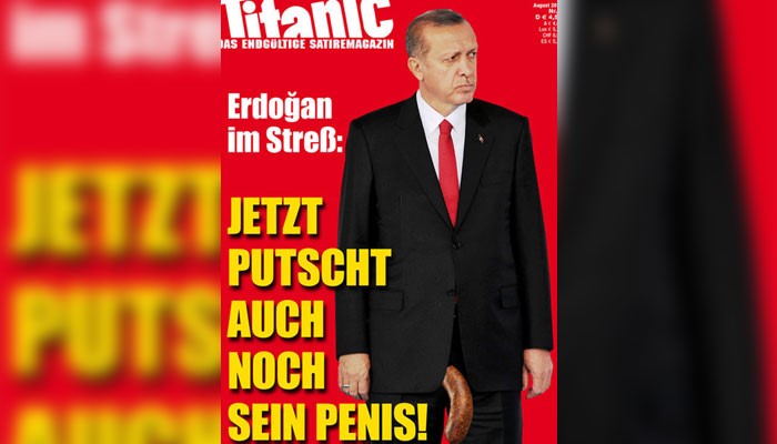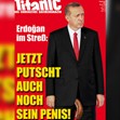 Германското сатирично списание „Титаник“ публикува на обложката на своя най-нов брой снимка на турския президент Реджеп Ердоган с разкопчан дюкян, от който се подава пържена наденичка.