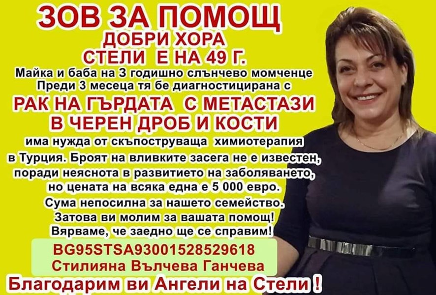 Сега има нужда от скъпо струваща химиотерапия в Турция. Броят на вливките засега не е известен, поради неяснота в развитието на заболяването, но цената на всяка една е 5 000 евро. Сума, непосилна за нашето семейство. Затова ви молим за вашата помощ! Вярваме, че заедно ще се справим!", пише семейството на жената на страницата на кампанията „Живот за Стели“ във Фейсбук.