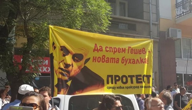Демонстрацията е под мотото "Да спрем Гешев - новата бухалка" и е организирана от "Демократична България". Иван Гешев е единственият засега кандидат за поста.