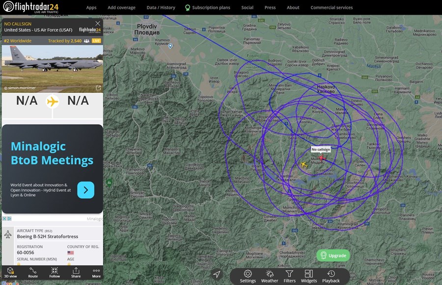 Два стратегически бомбардировача Boeing B-52H Stratofortress на американската армия извършиха тренировъчни мисии над Хасково и Кърджали. В продължение повече от два часа самолетите летяха в кръг над Югоизточна България, пише Dir.bg.