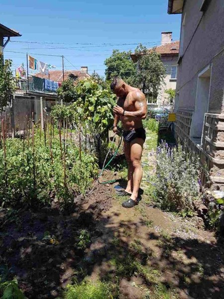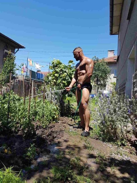 Екраният Митак показа, че селският живот изобщо не му е чужд, като се щракна, докато се грижи за лехите с домати на майка си в Свиленград.