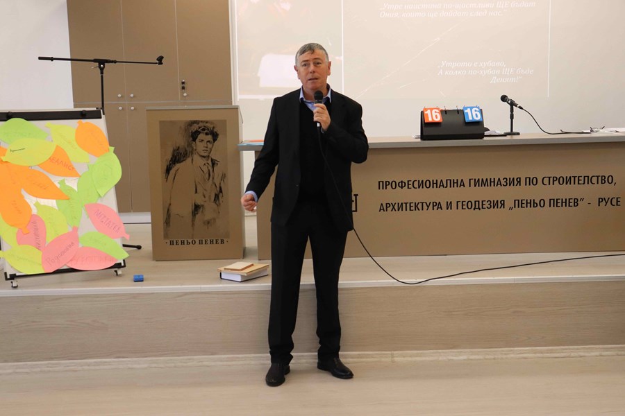По-рано днес в училището се проведе интердисциплинарен урок, посветен на живота и творчеството на патрона на гимназията. Той включваше освен преподаваното в часовете по история и цивилизация, български език и литература, както и по изобразително изкуство, много допълнителен материал, за който учениците трябваше сами да се подготвят. На събитието присъства и областният управител Данаил Ковачев. „През годините това училище се доказа като достоен пример за традиции и новаторство, утвърждавайки се като престижно учебно заведение, възпитаващо достойни граждани и добре подготвени специалисти в някои от най-значимите обществени сфери. Продължавайте да бъдете лидери и все така високопрофесионално ориентирани, допринасяйки за изграждането на съвременния облик на нашия град и регион. Благодаря Ви за енергията и професионализма, които влагате в ежедневната си дейност! Нека Вашите ученици да продължават развитието си в сферата на строителството и архитектурата с много амбиция и отличия“, каза областният управител в обръщението си към директора инж. Камелия Денчева и учителите. Същи така той пожела на екипа здраве, сили и вдъхновение, а на учениците да вървят смело напред по пътя към сбъдването на мечтите си. „Постигайте и успявайте! Вие можете, бъдете уверени в себе си!“, допълни Ковачев. Той също се включи в самия урок, като отбеляза малко известни факти за Пеньо Пенев. „Духът на Пеньо Пенев е бил по-силен от всички препятствия, които е срещал в живота“, заяви областният управител и сподели, че завършилите гимназията ще бъдат конкурентоспособни и годни за предизвикателствата на живота.