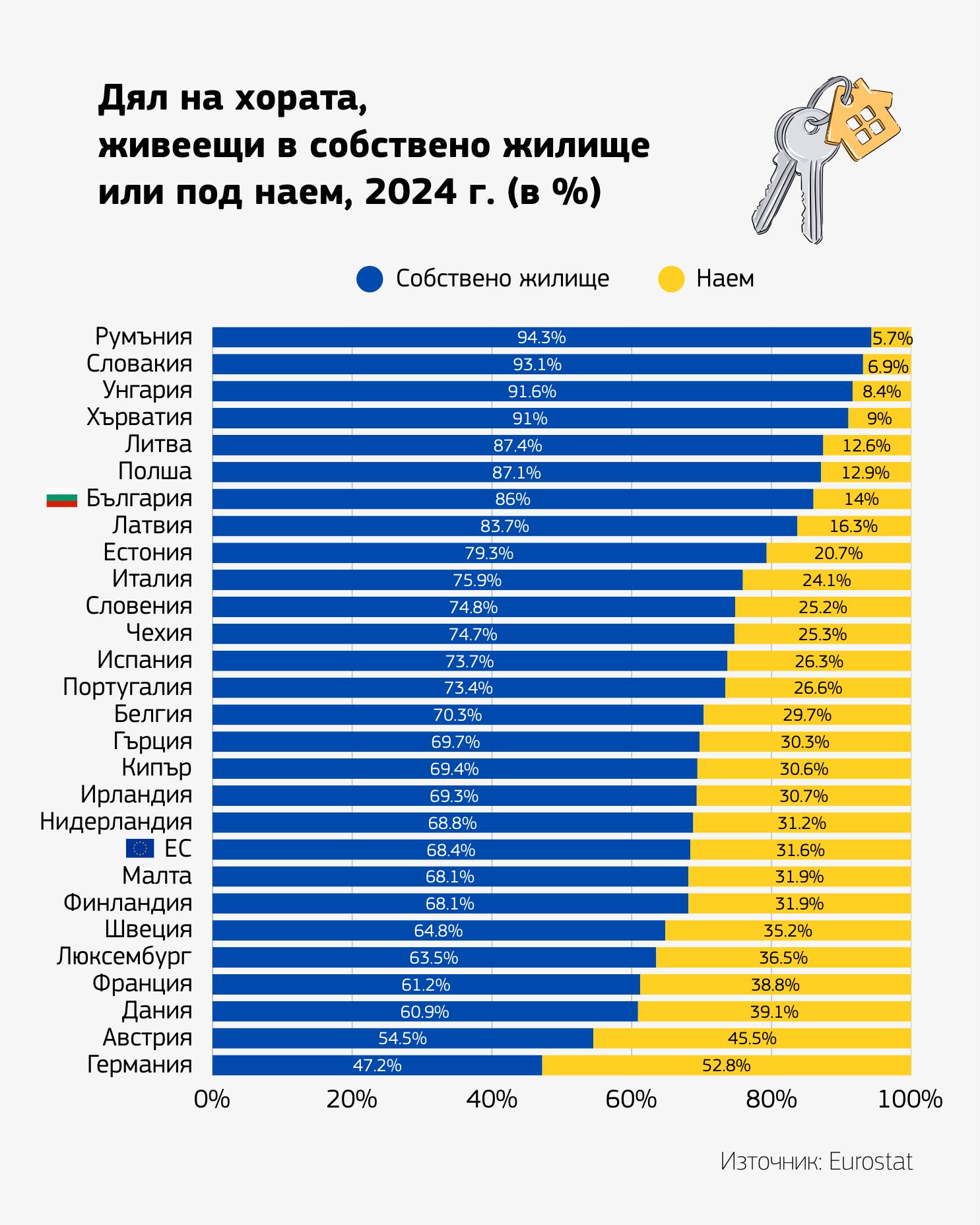 Данните разкриват сериозно разделение между Източна и Западна Европа по отношение на жилищния статут. Румъния заема първото място в ЕС, като 94.3% от населението там притежава дома си. Следват Словакия (93%), Унгария (92%) и Хърватия (91%).
