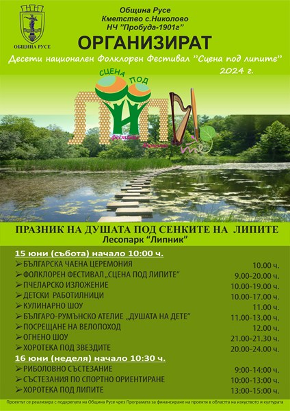 На 15 и 16 юни /събота и неделя/ в местността Лесопарк „Липник” ще се проведе 10-ото издание на Националния фолклорен фестивал „Сцена под липите”. Събитието се реализира с подкрепата на Община Русе, кметство Николово и Народно читалище „Пробуда - 1901“, като в него ще се включат близо 1000 участници и 100 състава от цялата страна и от съседна Румъния.