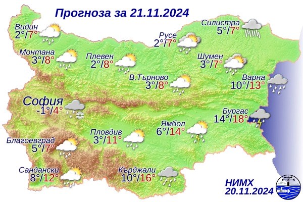 През нощта дъждовни валежи ще обхванат западните райони и Дунавската равнина. Във високите полета на Западна България и Предбалкана валежите ще преминат в сняг. Минималните температури ще варират между минус 2 и 6 градуса, като в югоизточните райони и Черноморието ще достигнат до 14 градуса.
