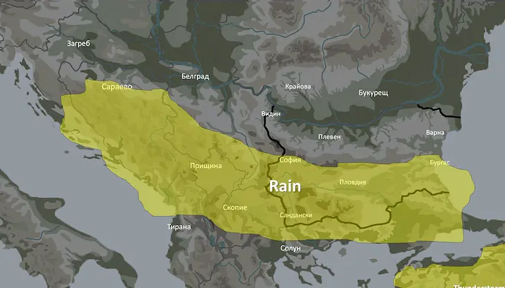 Влошаването на времето ще обхване и по-голямата част от Балканския полуостров заради преминаващо атмосферно смущение. Гръмотевични бури и силен вятър ще ударят Западните и Централните Балкани, като единствено Южна Гърция ще остане почти без валежи.