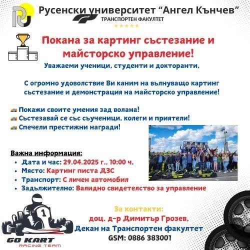 Транспортният факултет на Русенския университет "Ангел Кънчев" организира вълнуващо картинг състезание, съчетано с демонстрации по майсторско управление на автомобил. Събитието ще се проведе на 29 април (вторник) от 10:00 часа на картинг пистата в ДЗС, съобщиха от висшето училище.