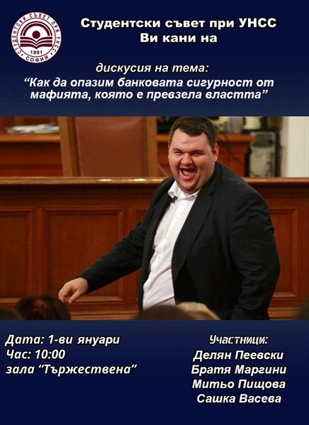 Студентският съвет на УНСС, организирал лекцията за свободното слово, е пратило и жалба до полицията с искане колаж от мрежата да бъде свален. Става въпрос за картинка, качена в страницата "Наука и критично мислене". Тя е ироничен колаж с Делян Пеевски, който кани студенти на лекция с тема "Как да опазим банковата сигурност от мафията, която е превзела властта". Фиктивната дата е 1-ви януари, а участници освен Пеевски са: Братя Маргини, Митьо Пищова и Сашка Васева.