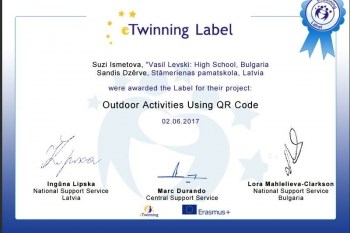 СУ "Васил Левски" - Русе е отличено с "Европейски знак за качество" по Програма e-Twinning - общността на училищата в Европа, по повод най-новия проект "Игри и дейности на открито, използвайки QR кодове".