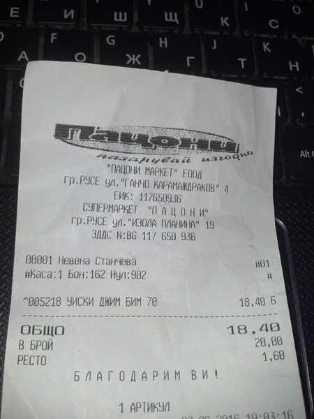В нея поместихме направените от господина снимки. При по-щателно вглеждане обаче се вижда, че има разминаване в датата на покупката на въпросното уиски и периода на брошурата на магазини "Пацони".