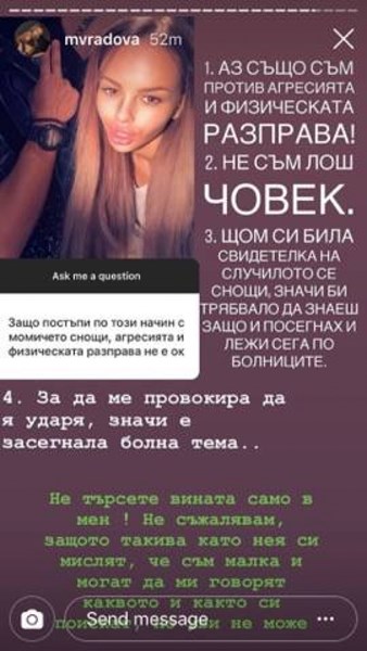 За да ме провокира да я ударя, значи е засегнала болна тема. Не съжалявам, защото такива като нея си мислят, че съм малка и могат да ми говорят както си искат, но уви – не може“, написа в Инстаграм тийнейджърката, прочула се с провокативните си клипове.