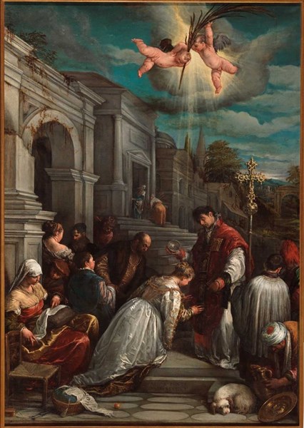 Свети Валентин (с червената наметка вдясно) кръщава света Луцила