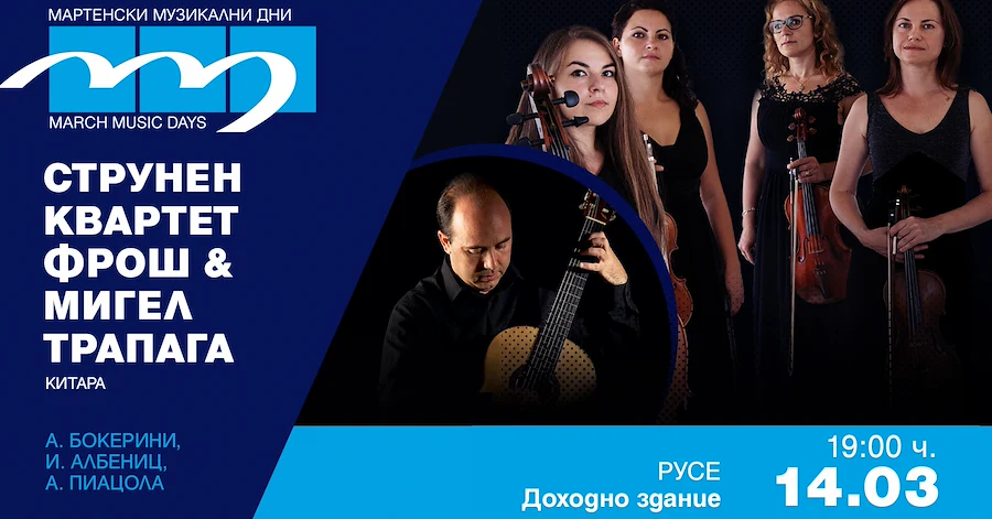 Музикалната програма ще продължи от 19:00 часа в Голямата зала на Доходното здание с концерт на струнен квартет "Фрош" и испанския китарист Мигел Трапага Санчес. Те ще изпълнят емблематичния Квинтет "Фанданго" от Луиджи Бокерини, произведения за соло китара от Исак Албениц и цикъла "Четирите сезона на Буенос Айрес" от Астор Пиацола.