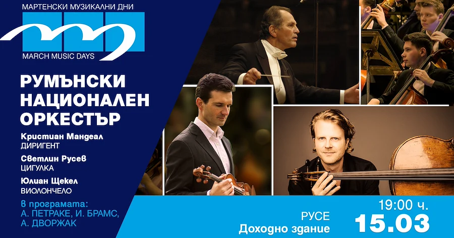 Акцентът в неделната програма пада върху концерта на Румънския национален симфоничен оркестър под диригентството на Кристиан Мандеал. Събитието ще започне от 19:00 часа, като на сцената ще излязат двама от най-търсените съвременни солисти – цигуларят Светлин Русев и виолончелистът Юлиан Щекел. Публиката ще чуе премиерното за България изпълнение на "Потапяне" от композитора А. Петраке, Двоен концерт за цигулка и виолончело от Йоханес Брамс, както и Симфония №8 от Антонин Дворжак.