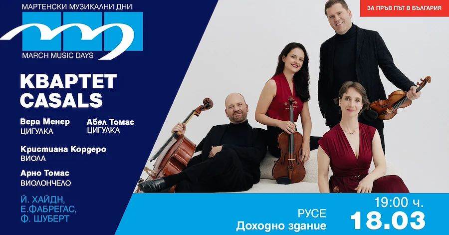 В сряда, 18 март, в Голямата зала на "Доходното здание" ще се състои концерт на престижния испански струнен квартет "Casals". Ансамбълът ще предложи на публиката шедьоври на Йозеф Хайдн и Франц Шуберт, както и съвременната композиция "Fiery Earth", дело на Елисенда Фабрегас.