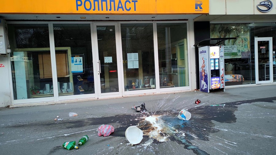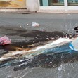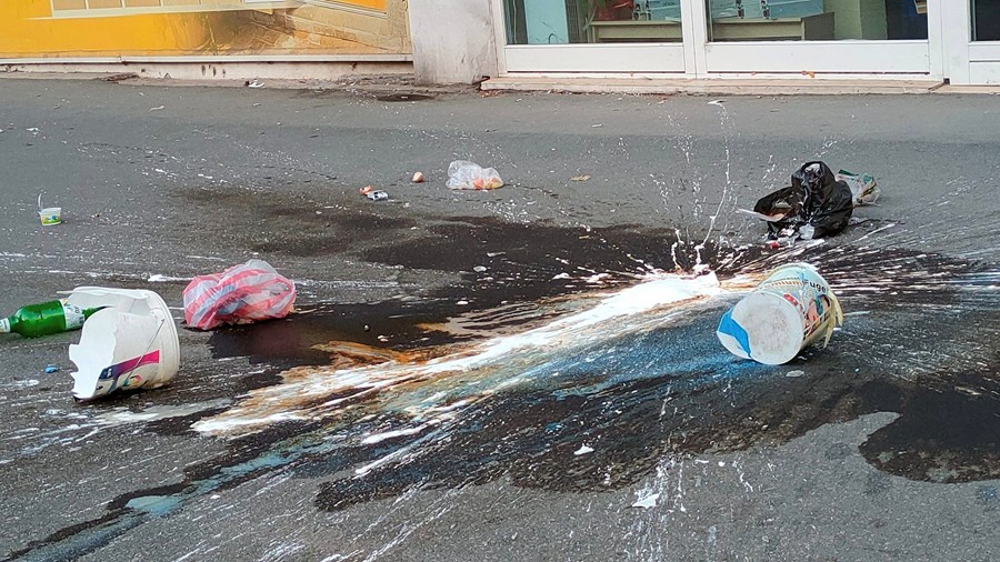 "За пореден път на улица "Борисова" в 7:30 часа", пише Надежда Букева в публикацията си. На снимката се виждат две кофи с боя и разредители, разбити на тротоара, а течността е разплисканата по целия тротоар.