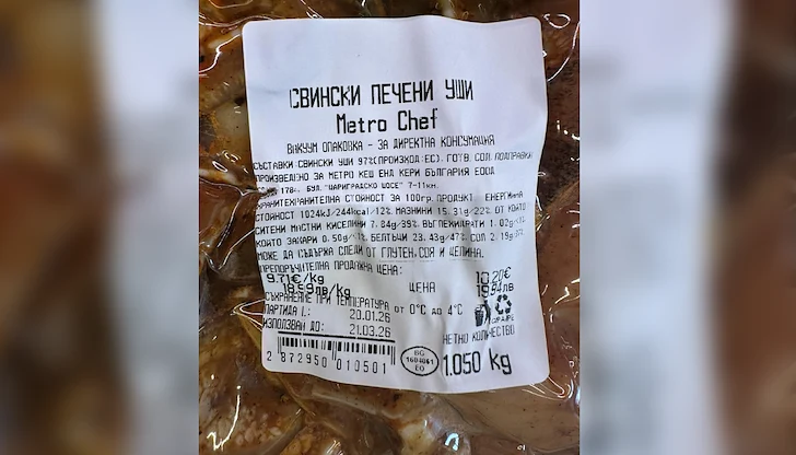 Журналистът сподели снимка на етикет от голяма търговска верига, на който се вижда вакуумирана опаковка с печени свински уши.