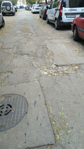 Шахтите на ВиК са потънали, оставяйки дупки с 20 сантиметра навътре в асфалтовото покритие. Достатъчно големи, че ако в тъмното ходиш пеша, ще хлътнеш и ще се потрошиш. Ако си с кола - значи ще си счупиш автомобила. Даже, ако имаше някой по-находчив автомонтьор, щеше да разкрие на улицата сервиз, защото всеки ден някой пропада в дупките. Поне оборот ще има човекът....досущ като в един френски филм от 70-те години.