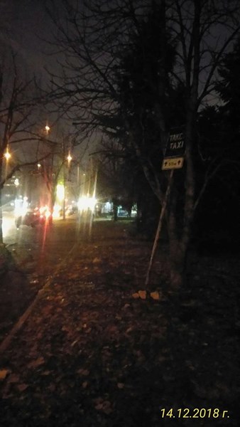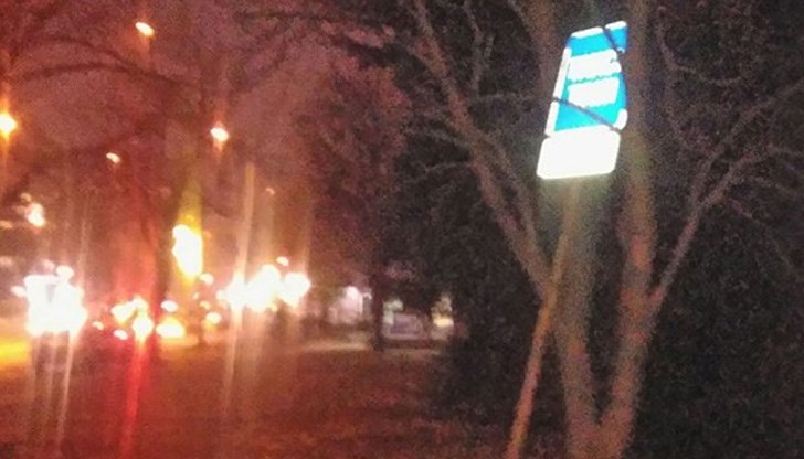 Мястото за таксита в района срещу комплекс "ДАВ" е обозначено със знак, който е "полегнал" върху дърво в близкото затревено пространство.